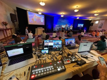 Hybrid and virtual event production combining live audiences with remote presenters using video conferencing platforms and broadcast-quality workflows.